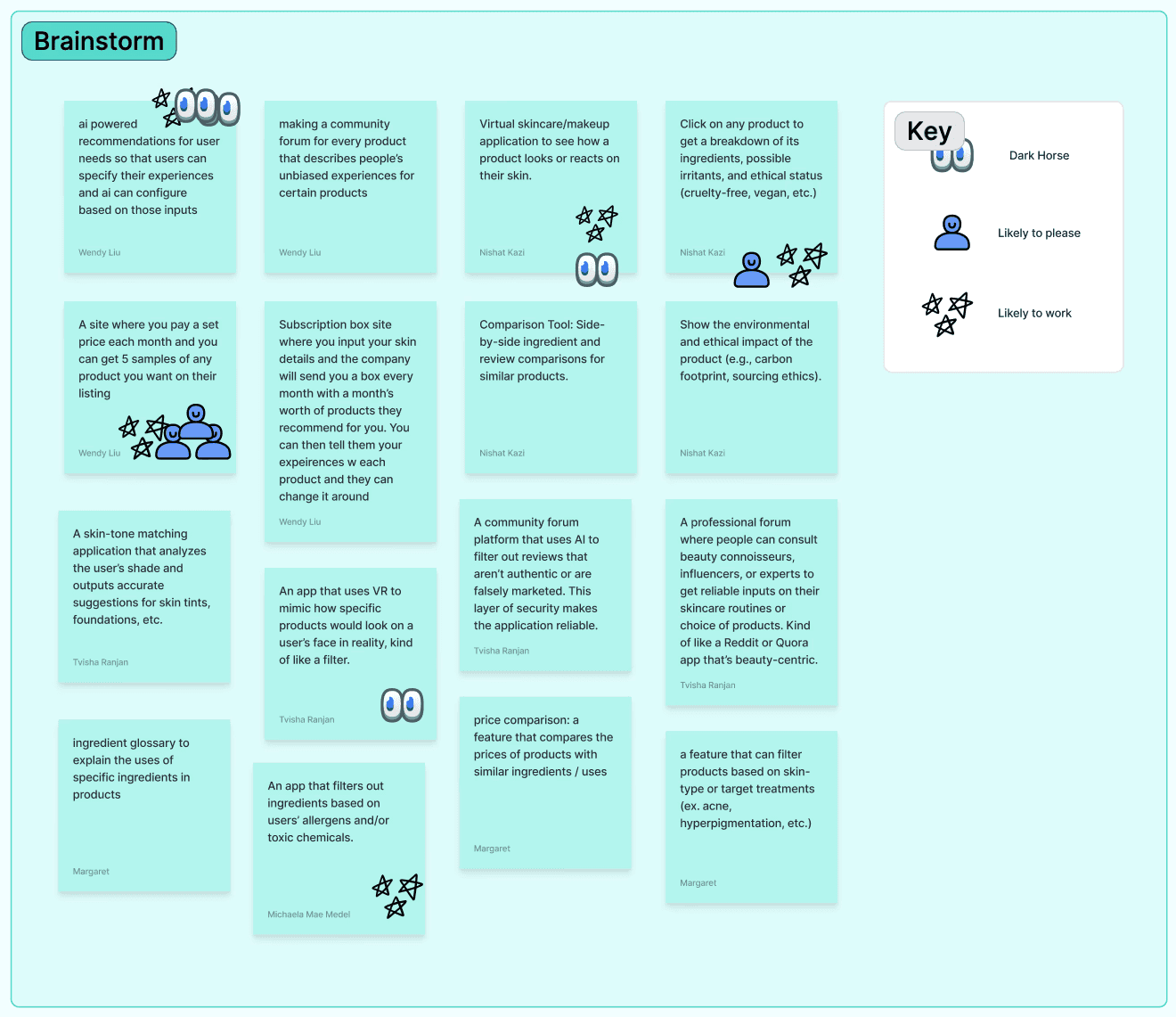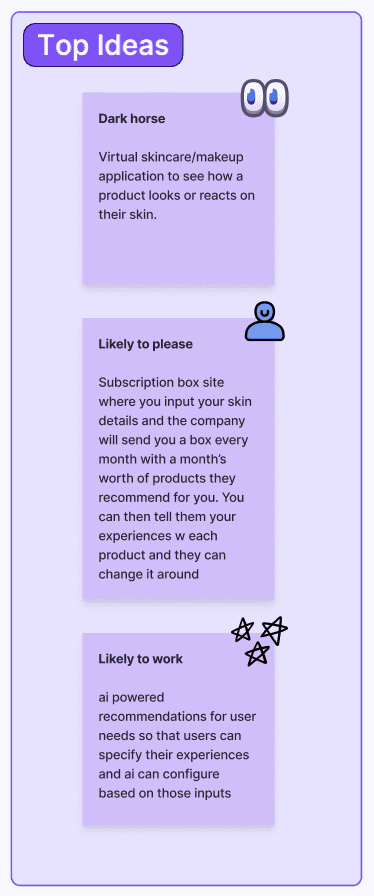 We brainstormed solutions across three categories - dark horse (most bold), likely to please, and likely to work.